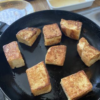 いつもうちで作っている食パンは、翌々日くらいまで、トーストしなくても、そのままかじりついて食べれるくらいにやわらかいです。だけど、さすがに3日目くらいになると、ややパサつきます。最近は、そのパサついた食パンをフレンチトーストにしていただくのがお気に入りです。卵と砂糖と牛乳、あるいは豆乳を混ぜたもをパンに染み込ませます。このときに、8等分くらいに小さく切ってから浸すのおススメです!焼く時は、コロコロひっくりかえしながら、全部の面にこんがり焼き色をつけます。食べるときに、切らないでいいのが楽ちんです。しかも、カリカリ度もアップ!で、スナック感覚でいただけます。おいしすぎるので、食べすぎ注意ですが、、、。