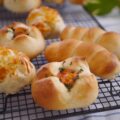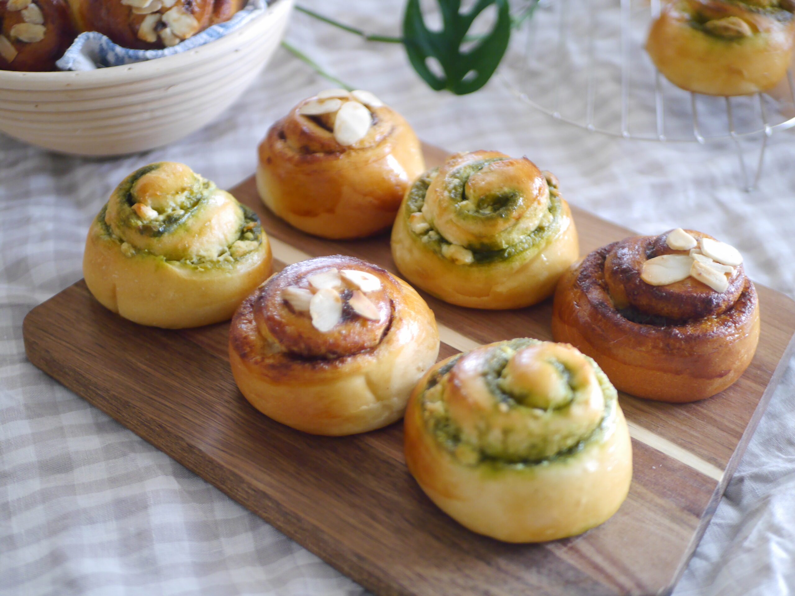 2種類のうずまきパンを作ります。ひとつは、抹茶とホワイトチョコ。ふたつの相性がとってもよくて、お口の中でなんともいえない味のハーモニーが生まれます。もうひとつは、シナモンとレーズン。定番のトッピングですが、お好みでラム酒につけたレーズンをいれることもできますよ!具材をのせてから巻いていくときの成形のコツをていねいにお伝えします。型にいれずに焼きますが、しっかり高さのあるやわらかいパンに仕上がります!